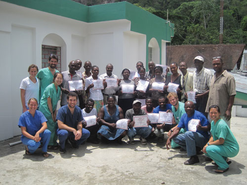 In addition to the community-based public health projects, the Tufts in Haiti students conducted a series of five half-day workshops for an enthusiastic group of Community Health Agents from the Milot commune, in order to promote skill building and enhanced knowledge. The training topics included: Emergency First Aid, Hypertension and Urine Dipstick Analysis, Water Decontamination, Maternal Health, and Childhood Nutrition.